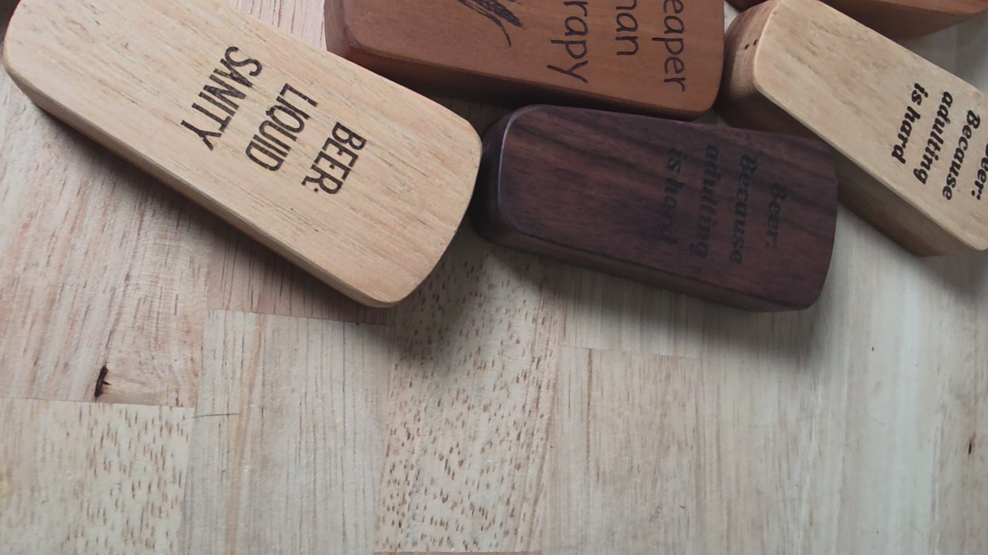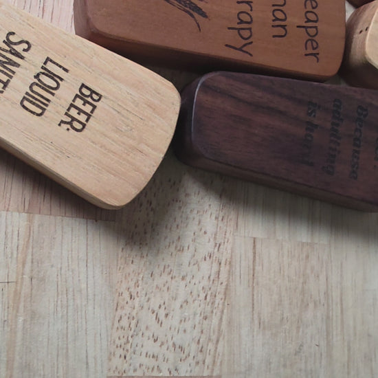 Handcrafted hardwood magnetic bottle opener with fun, snarky sayings—compact, stylish, and always within reach.