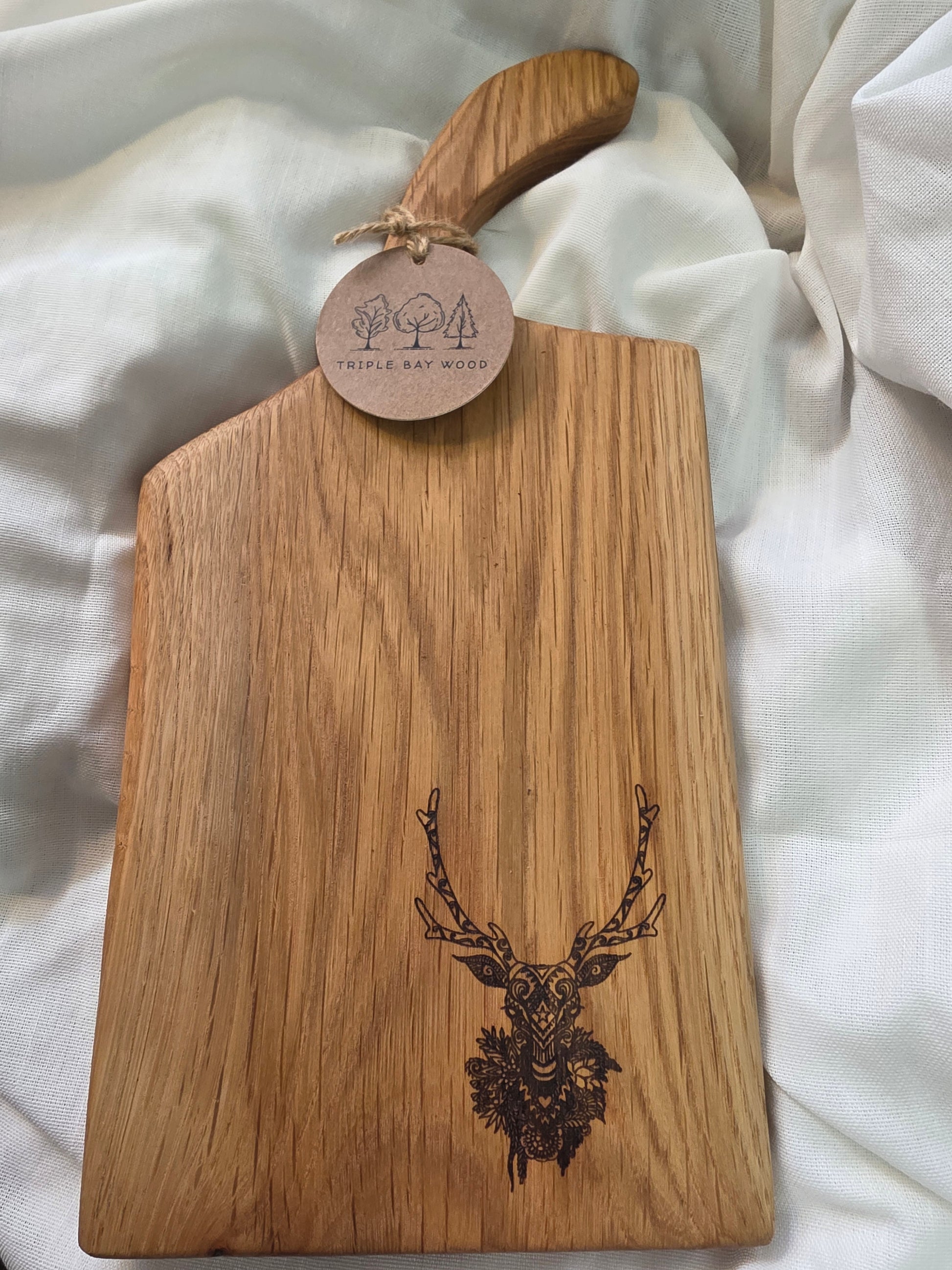 Eco friendly wooden bread or cheese or serving board with engraved deer. This oak wood board with handle is a handmade and becomes a piece of wood art for everyday use for every nature lover. Eco friendly, natural and meaningful gift for yourself or as a gift.