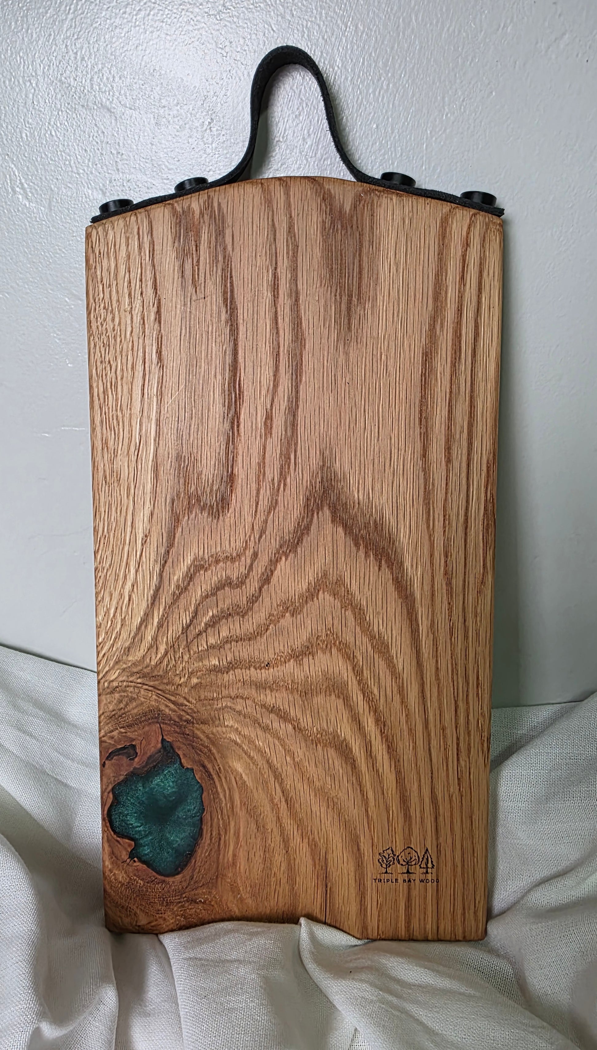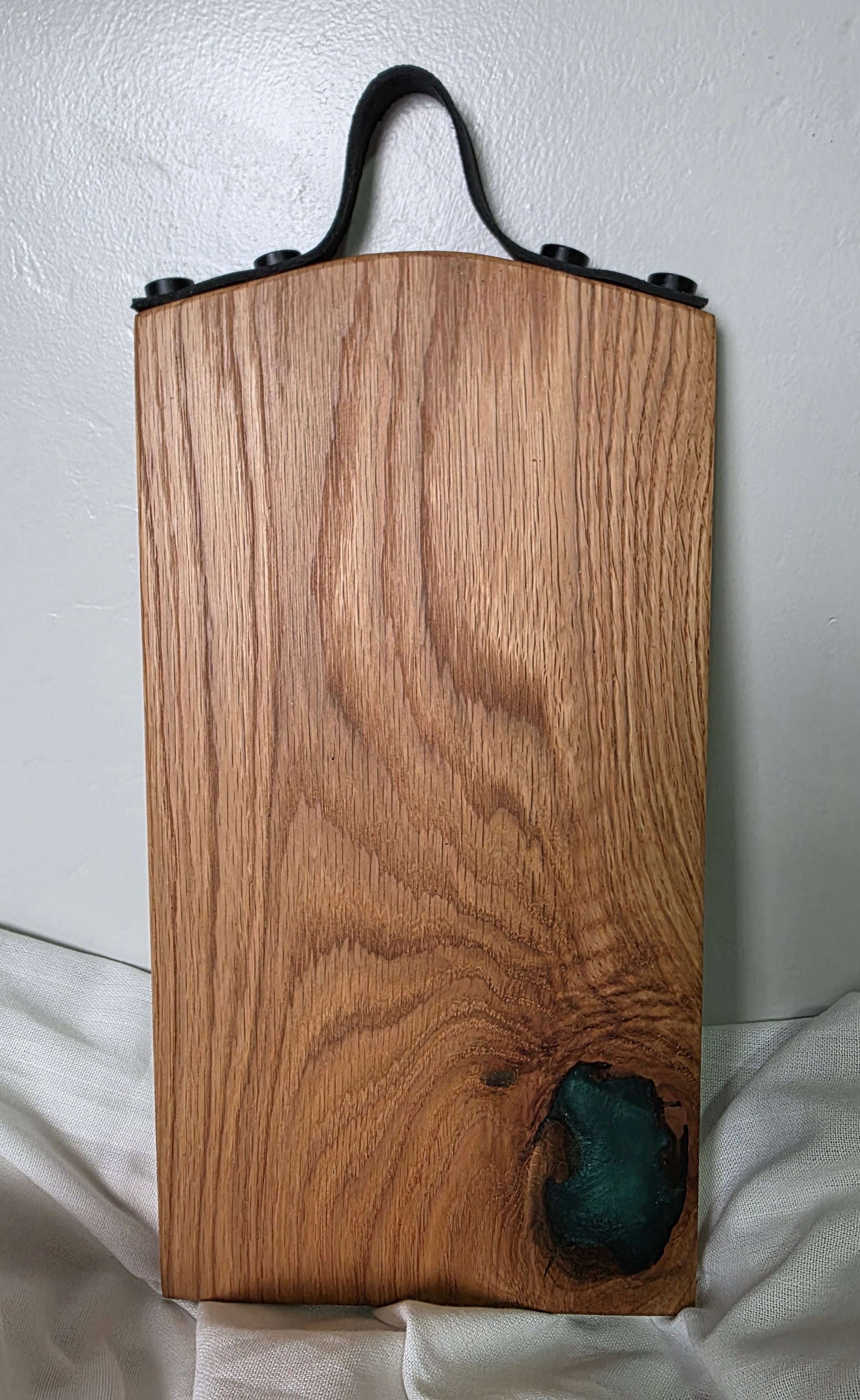 This one-of-a-kind serving board blends the warmth of white oak with striking green resin details, finished with a unique leather handle. Changed up the usual wood handle and reimagined it with leather for a modern rustic vibe.